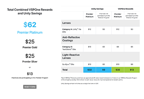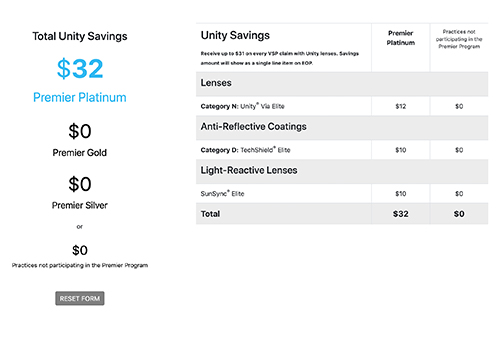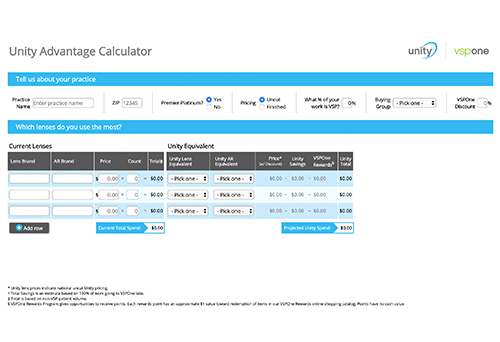 Use estimated monthly orders to calculate how much more a practice can earn with Unity Savings and VSPOne Rewards combined.